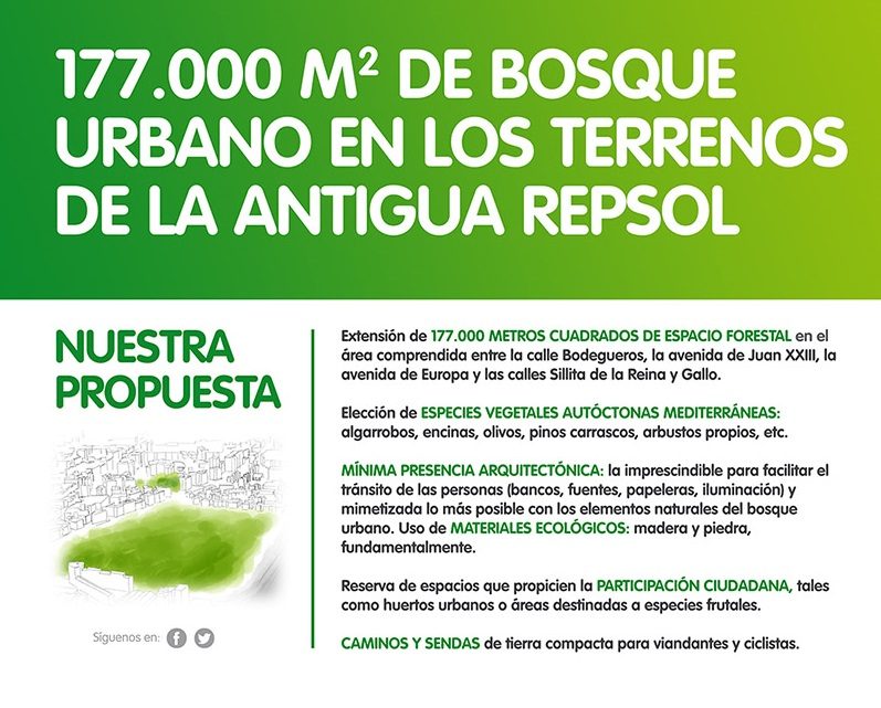 In our province we have the non-partisan platform Bosque Urbano Málaga, which advocates turning the 177,000 square meters of land that once were occupied by the old Repsol drums in Malaga into an authentic forest area. The space is located between the districts of Cruz del Humilladero and Cádiz Road, two of the most densely populated areas in Europe. You can read the open accession letter that was published in the following link: