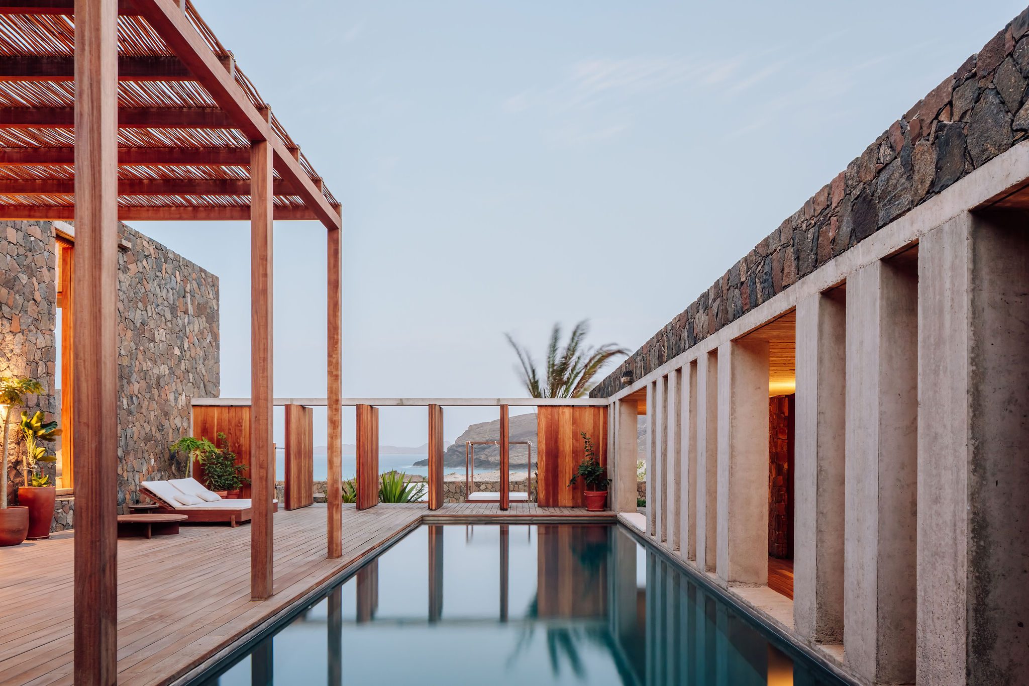 Se trata de un complejo de villas del lujo recubiertas por piedras locales combinada con el concepto de “extraño paisaje lunar” típico de la Bahía de João d'Evora. Los interiores de las estructuras han sido acertadamente diseñados, eligiendo los tonos más naturales usando materias primas autóctonas para su fabricación. Los grandes ventanales ocupan completamente la pared y ofrecen a los huéspedes una vista sobre el inmenso océano Atlántico.