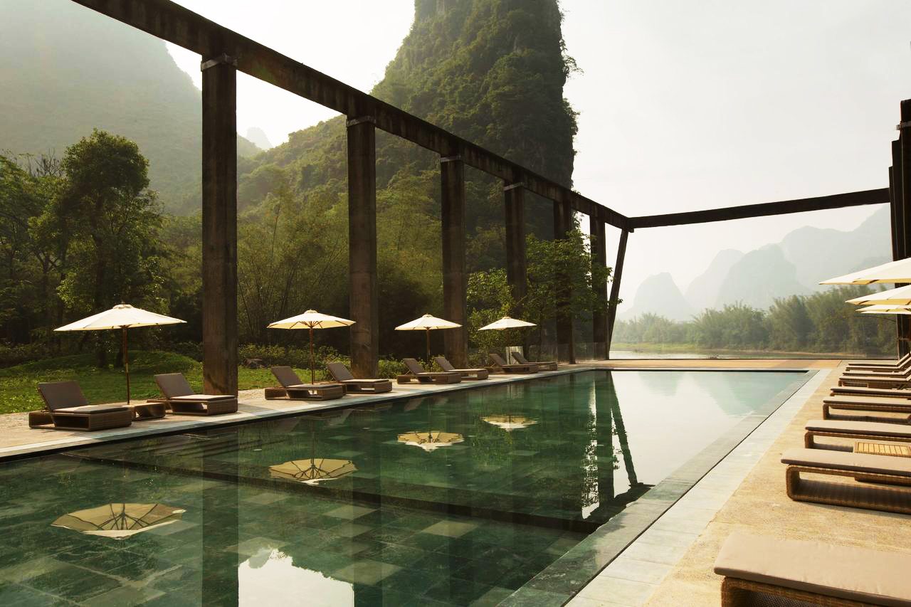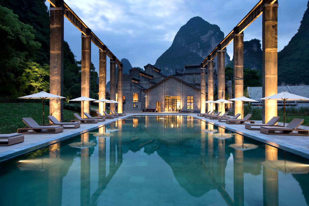 Escondido entre dos montañas gigantes de la región china Guangxi, este hotel está situado en Yangshuo, sobre los restos de una vieja fábrica de azúcar y un molino construido en los años 60 junto al río Li y las montañas de piedra caliza. El diseñador Dong Gong combina a la perfección los edificios antiguos con el diseño moderno y los pequeños detalles. ¡Un entorno de lujo!